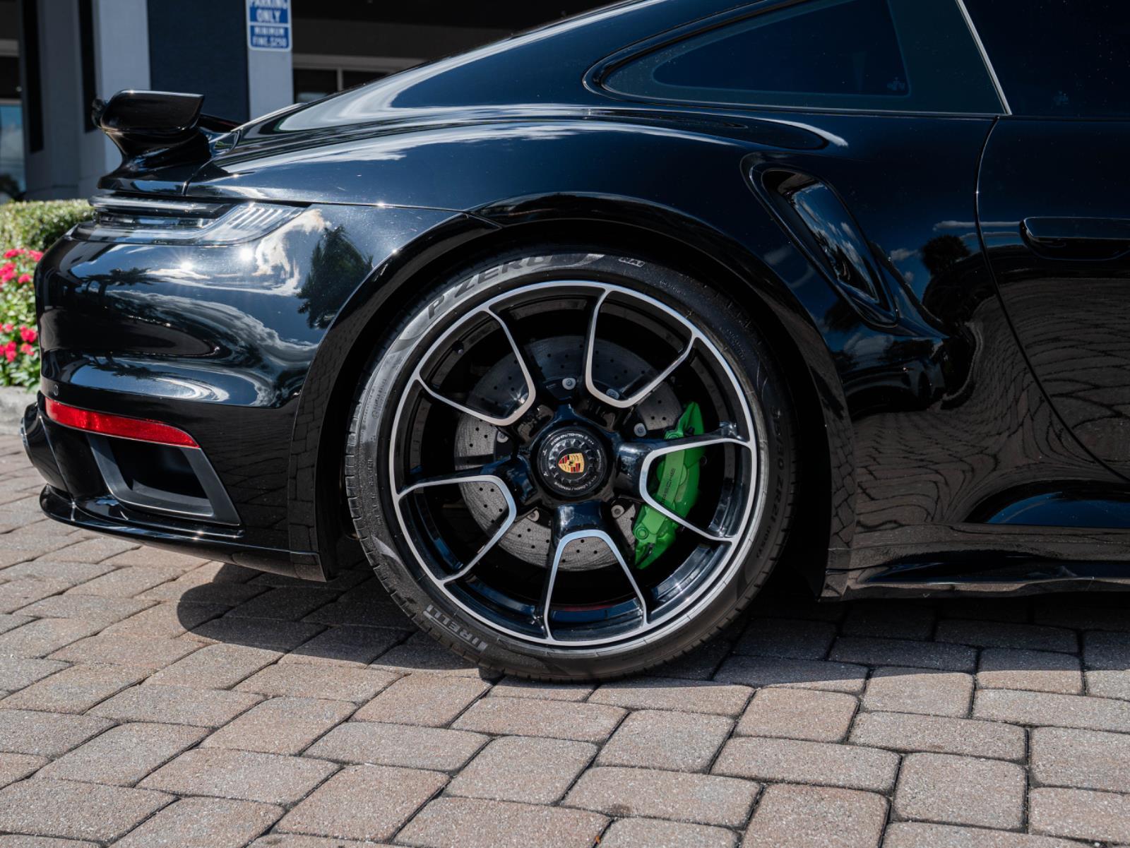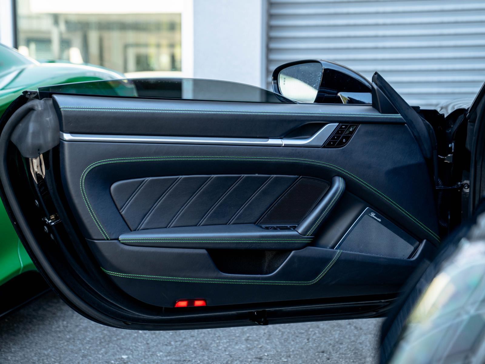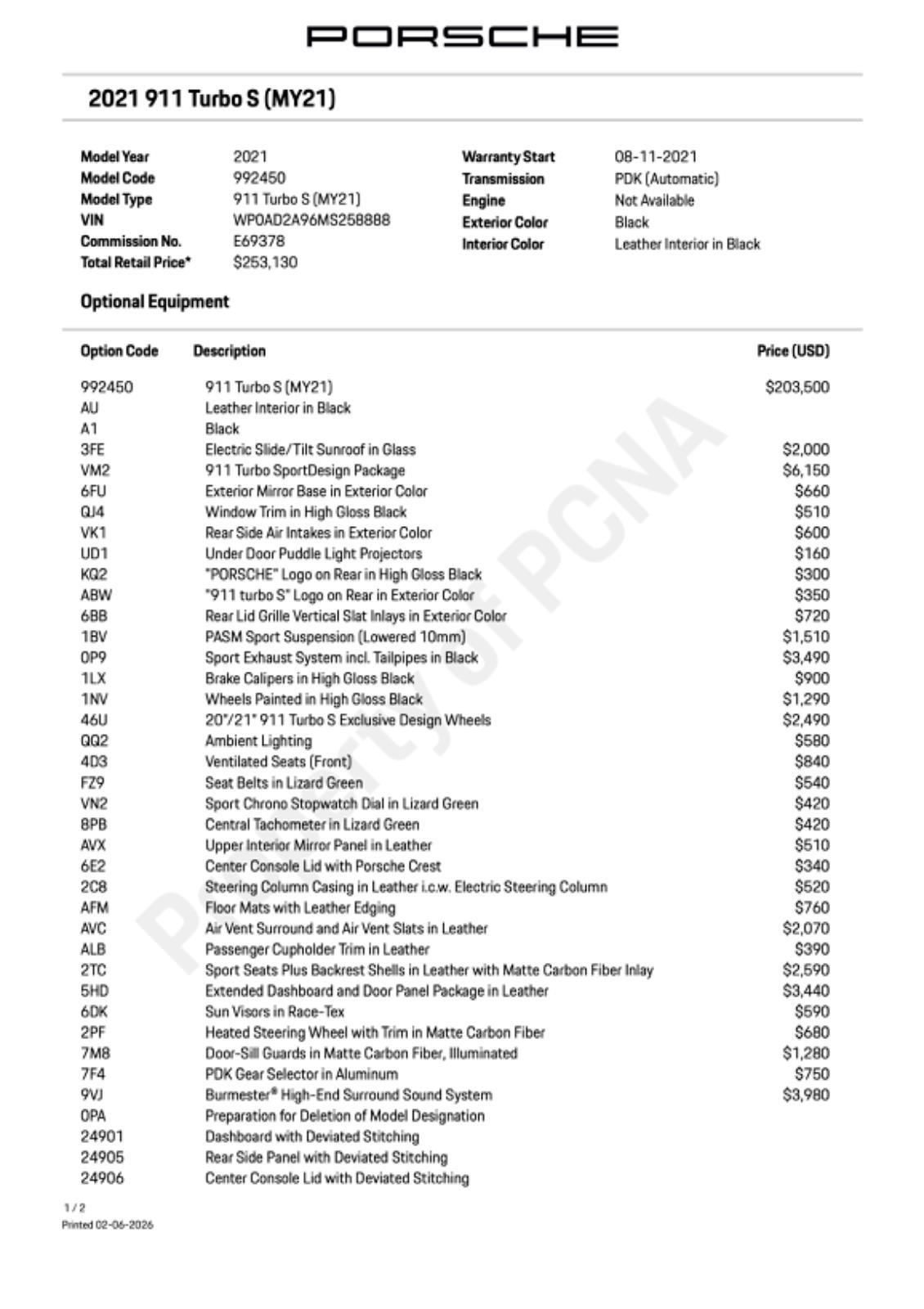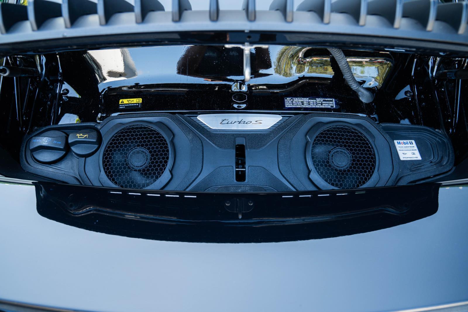 Options\n\nLeather Interior in Black\nBlack\nElectric Slide/Tilt Sunroof in Glass\n911 Turbo SportDesign Package\nExterior Mirror Base in Exterior Color\nWindow Trim in High Gloss Black\nRear Side Air Intakes in Exterior Color\nUnder Door Puddle Light Projectors\n"PORSCHE" Logo on Rear in High Gloss Black\n"911 turbo S" Logo on Rear in Exterior Color\nRear Lid Grille Vertical Slat Inlays in Exterior Color\nPASM Sport Suspension (Lowered 10mm)\nSport Exhaust System incl. Tailpipes in Black\nBrake Calipers in High Gloss Black\nWheels Painted in High Gloss Black\n20"/21" 911 Turbo S Exclusive Design Wheels\nAmbient Lighting\nVentilated Seats (Front)\nSeat Belts in Lizard Green\nSport Chrono Stopwatch Dial in Lizard Green\nCentral Tachometer in Lizard Green\nUpper Interior Mirror Panel in Leather\nCenter Console Lid with Porsche Crest\nSteering Column Casing in Leather with Electric Steering Column\nFloor Mats with Leather Edging\nAir Vent Surround and Air Vent Slats in Leather\nPassenger Cupholder Trim in Leather\nSport Seats Plus Backrest Shells in Leather with Matte Carbon Fiber Inlay\nExtended Dashboard and Door Panel Package in Leather\nSun Visors in Race-Tex\nHeated Steering Wheel with Trim in Matte Carbon Fiber\nDoor-Sill Guards in Matte Carbon Fiber, Illuminated\nPDK Gear Selector in Aluminum\nBurmester® High-End Surround Sound System\nPreparation for Deletion of Model Designation\nDashboard with Deviated Stitching\nRear Side Panel with Deviated Stitching\nCenter Console Lid with Deviated Stitching\n\nInside, the cabin reflects an extensive factory option list with premium materials and distinctive contrast details. Sport Seats Plus with matte carbon-fiber backrest shells are complemented by seat ventilation, extended leather packages across the dashboard and door panels, Race-Tex sun visors, illuminated carbon-fiber door-sill guards, and a Porsche crest center console lid. Unique lizard-green accents on the seat belts, central tachometer, and Sport Chrono stopwatch dial add a bespoke motorsport touch, while the Burmester High-End Surround Sound System and PASM Sport Suspension (lowered 10 mm) complete a build that balances luxury, exclusivity, and dynamic capability.\n\n