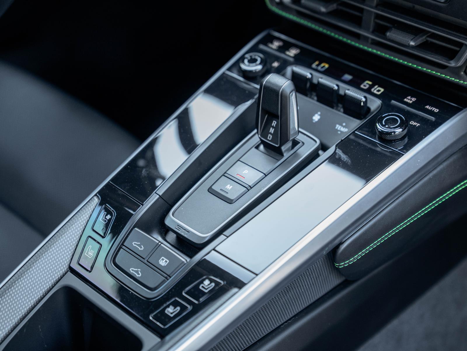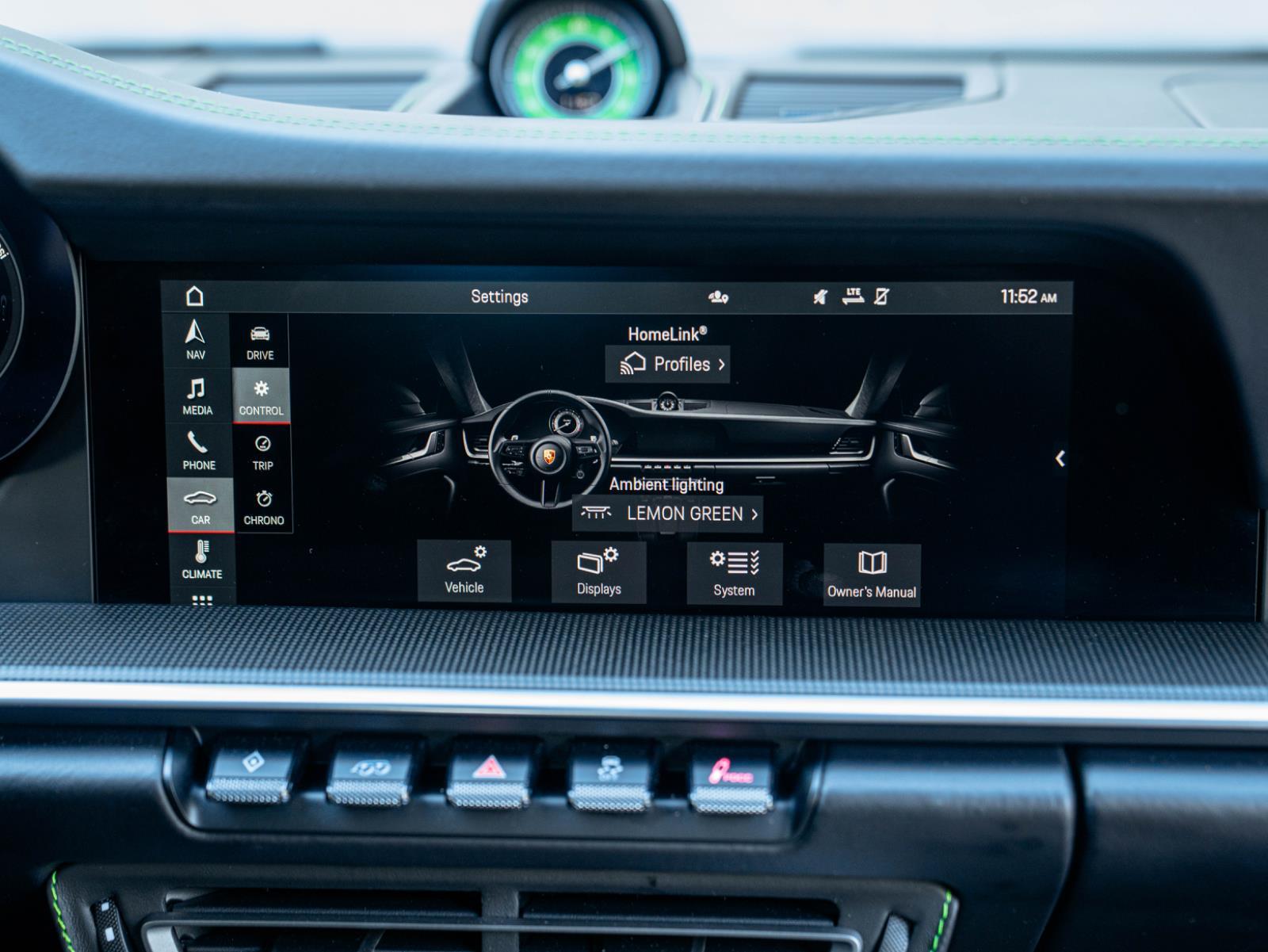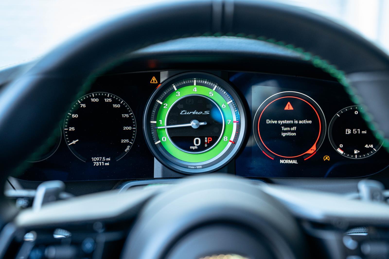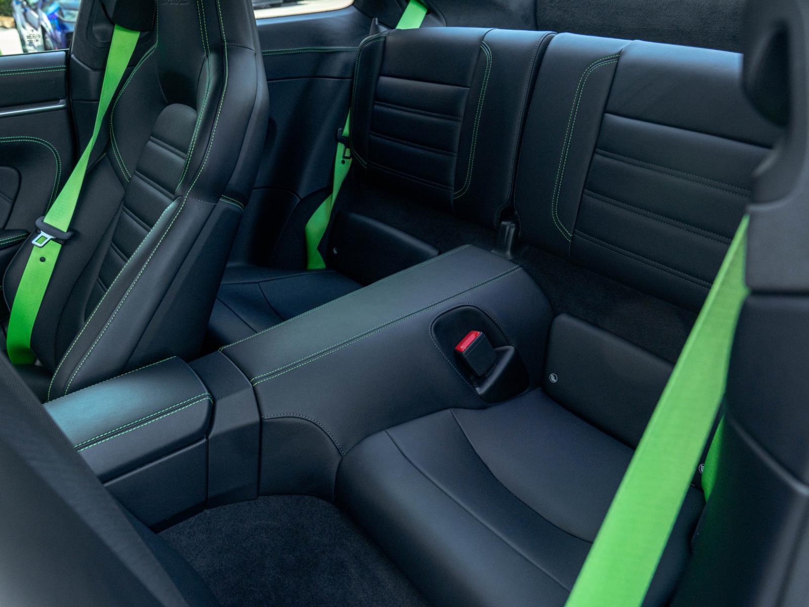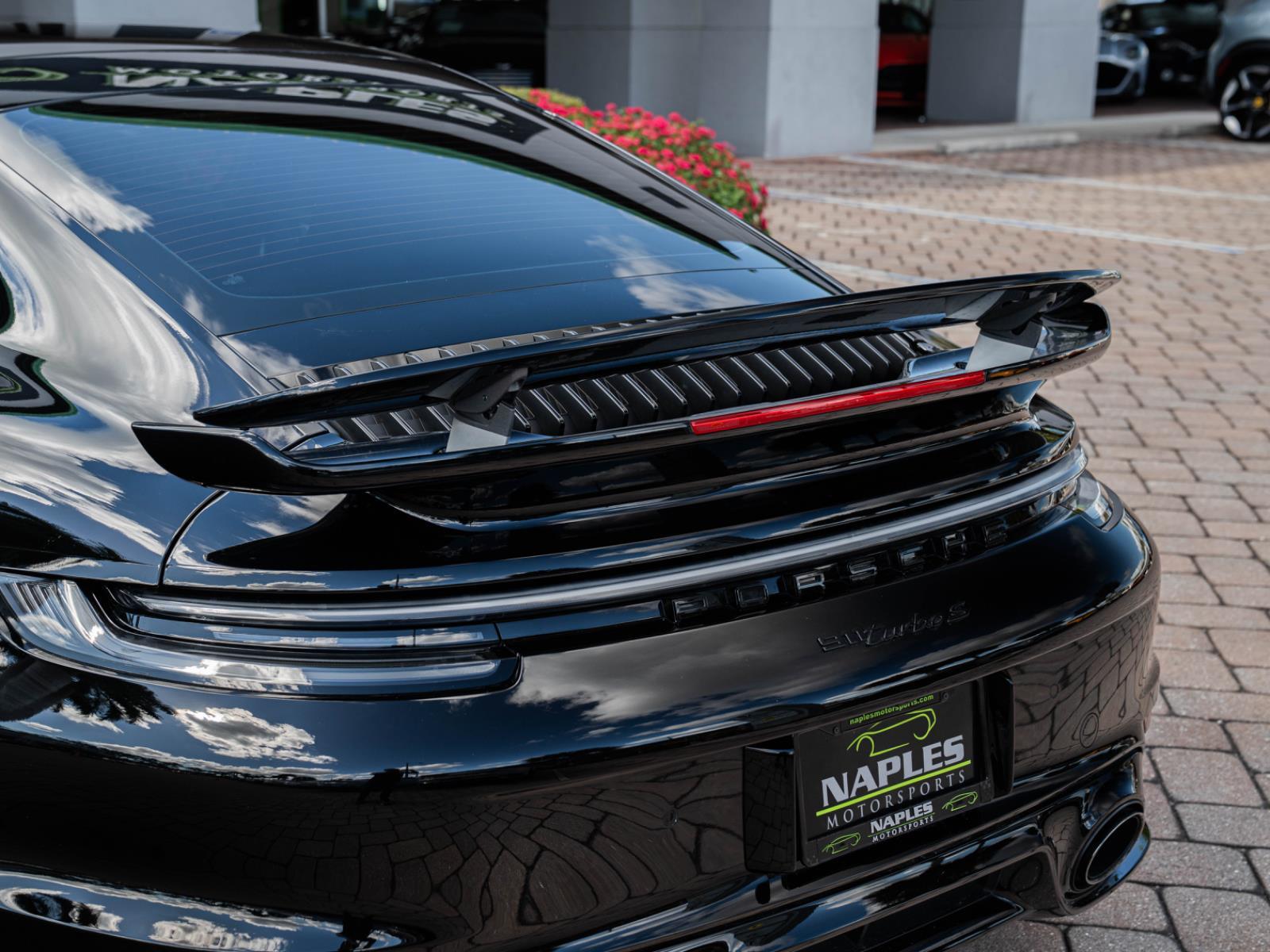 Options\n\nLeather Interior in Black\nBlack\nElectric Slide/Tilt Sunroof in Glass\n911 Turbo SportDesign Package\nExterior Mirror Base in Exterior Color\nWindow Trim in High Gloss Black\nRear Side Air Intakes in Exterior Color\nUnder Door Puddle Light Projectors\n"PORSCHE" Logo on Rear in High Gloss Black\n"911 turbo S" Logo on Rear in Exterior Color\nRear Lid Grille Vertical Slat Inlays in Exterior Color\nPASM Sport Suspension (Lowered 10mm)\nSport Exhaust System incl. Tailpipes in Black\nBrake Calipers in High Gloss Black\nWheels Painted in High Gloss Black\n20"/21" 911 Turbo S Exclusive Design Wheels\nAmbient Lighting\nVentilated Seats (Front)\nSeat Belts in Lizard Green\nSport Chrono Stopwatch Dial in Lizard Green\nCentral Tachometer in Lizard Green\nUpper Interior Mirror Panel in Leather\nCenter Console Lid with Porsche Crest\nSteering Column Casing in Leather with Electric Steering Column\nFloor Mats with Leather Edging\nAir Vent Surround and Air Vent Slats in Leather\nPassenger Cupholder Trim in Leather\nSport Seats Plus Backrest Shells in Leather with Matte Carbon Fiber Inlay\nExtended Dashboard and Door Panel Package in Leather\nSun Visors in Race-Tex\nHeated Steering Wheel with Trim in Matte Carbon Fiber\nDoor-Sill Guards in Matte Carbon Fiber, Illuminated\nPDK Gear Selector in Aluminum\nBurmester® High-End Surround Sound System\nPreparation for Deletion of Model Designation\nDashboard with Deviated Stitching\nRear Side Panel with Deviated Stitching\nCenter Console Lid with Deviated Stitching\n\nInside, the cabin reflects an extensive factory option list with premium materials and distinctive contrast details. Sport Seats Plus with matte carbon-fiber backrest shells are complemented by seat ventilation, extended leather packages across the dashboard and door panels, Race-Tex sun visors, illuminated carbon-fiber door-sill guards, and a Porsche crest center console lid. Unique lizard-green accents on the seat belts, central tachometer, and Sport Chrono stopwatch dial add a bespoke motorsport touch, while the Burmester High-End Surround Sound System and PASM Sport Suspension (lowered 10 mm) complete a build that balances luxury, exclusivity, and dynamic capability.\n\n