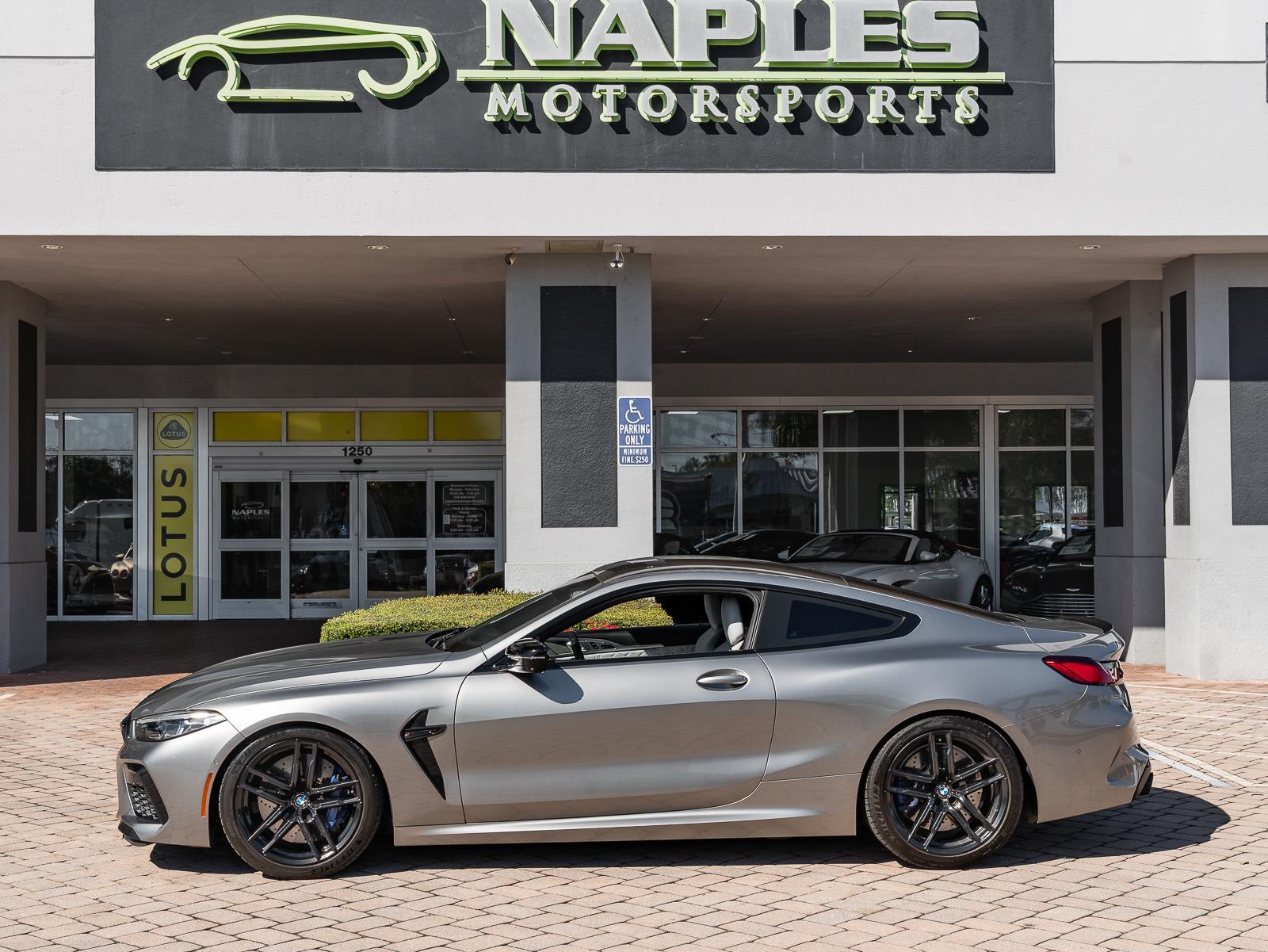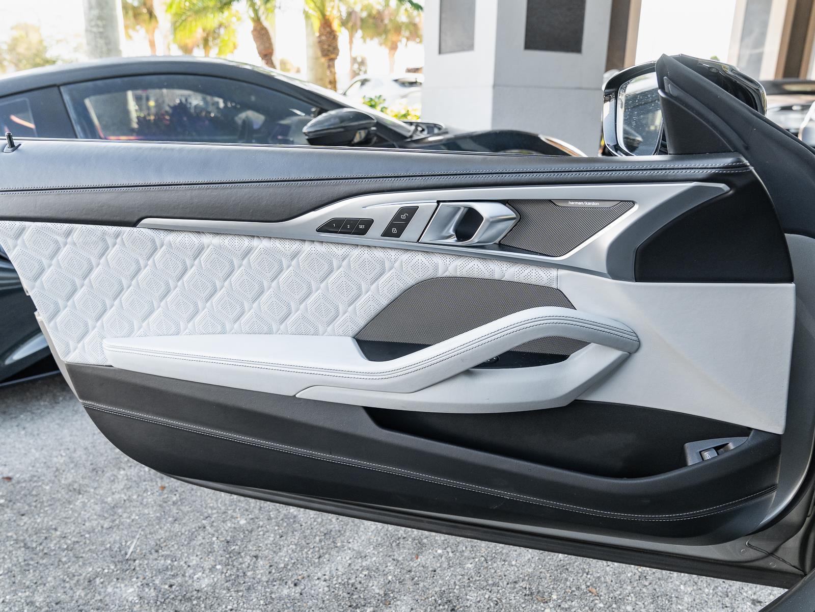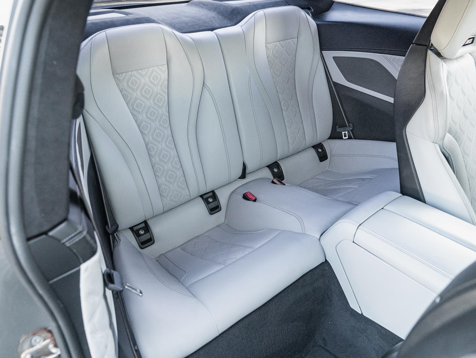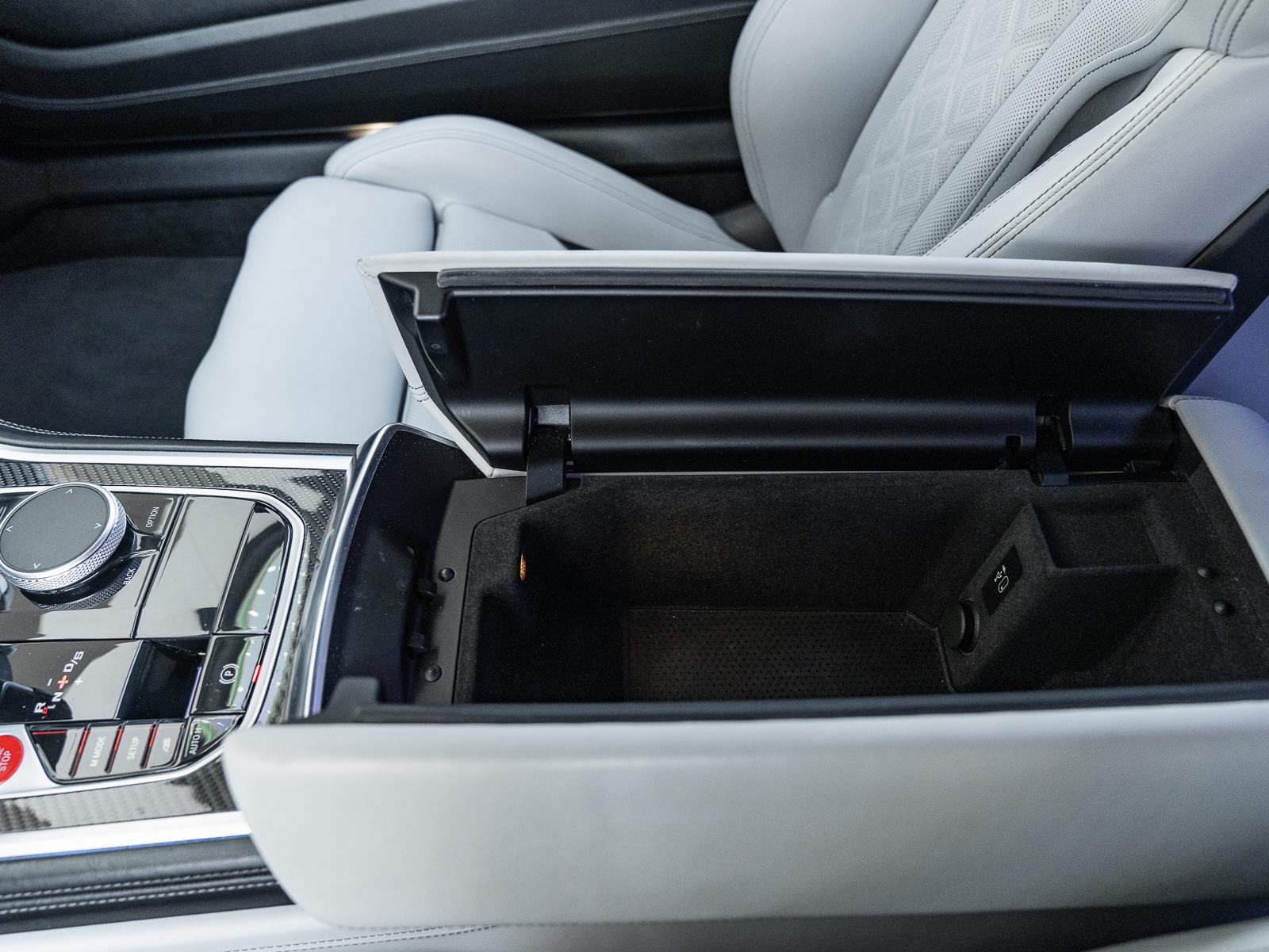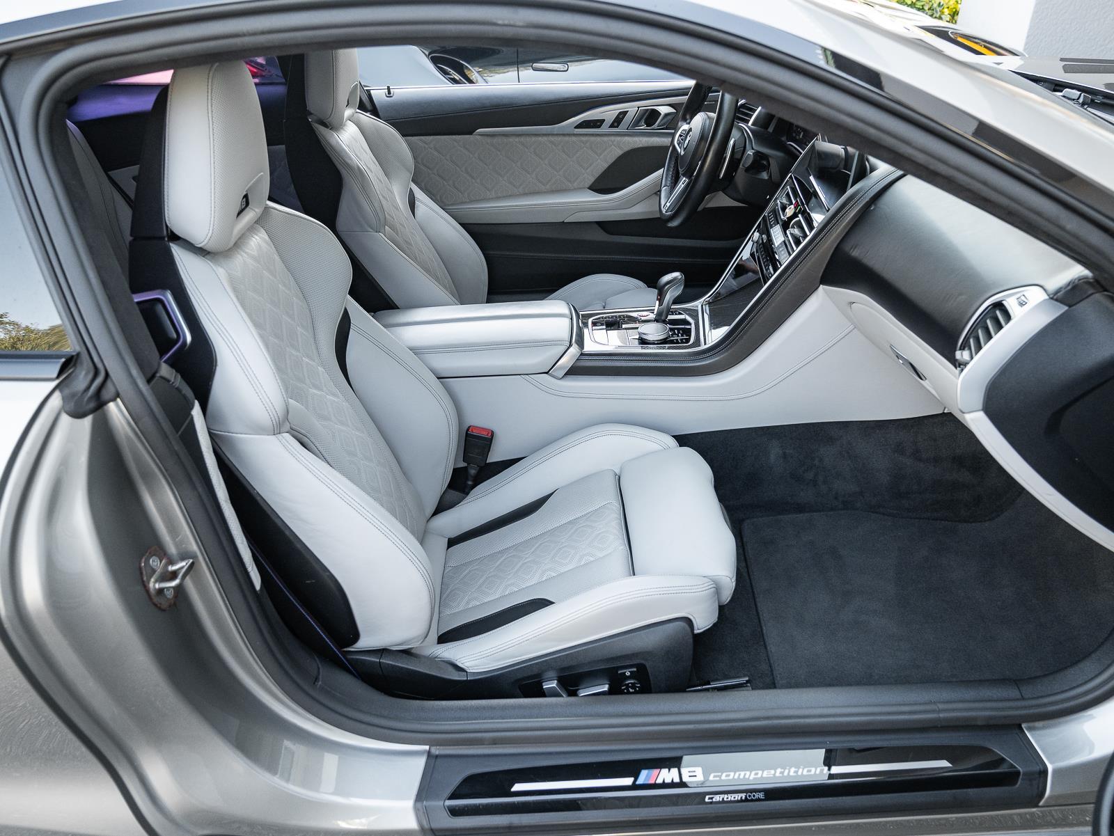 This 2022 BMW M8 Competition in Donington Grey Metallic over white interior and showing 32,790 miles combines brute force with refined grand touring manners. Power comes from a 4.4 liter twin turbocharged V8 producing 617 horsepower and 553 lb ft of torque, sent through an 8 speed M Steptronic automatic transmission and BMW M xDrive all wheel drive with rear biased calibration and the ability to decouple the front axle for pure rear wheel drive behavior. Official factory acceleration is 0 to 60 mph in 3.0 seconds. Top speed is electronically limited to 155 mph. Curb weight for the coupe specification is 4,355 lb, which the chassis balances with careful weight distribution to deliver both composure and urgency on demand.\n\nChassis hardware and driver aids underline why the M8 Competition feels both planted and rapid. Front suspension uses a strut and wishbone layout paired to a multi link rear suspension with Adaptive M Dampers that adjust in milliseconds across drive modes, while an Active M Differential, M specific stability control algorithms, and launch control translate power to the pavement with precision. Stopping power includes large performance brakes with optional M carbon ceramic brakes for extreme fade resistance and lower unsprung mass. Important owner features include M specific sport seats trimmed in premium leather, M Drive configurable displays and steering wheel integrated controls, adaptive M suspension settings, an M Sport exhaust with variable sound modes, and extensive driver assistance and comfort options that make the car equally capable on long highway runs and track days.\n\n