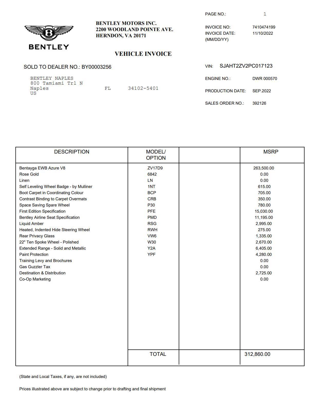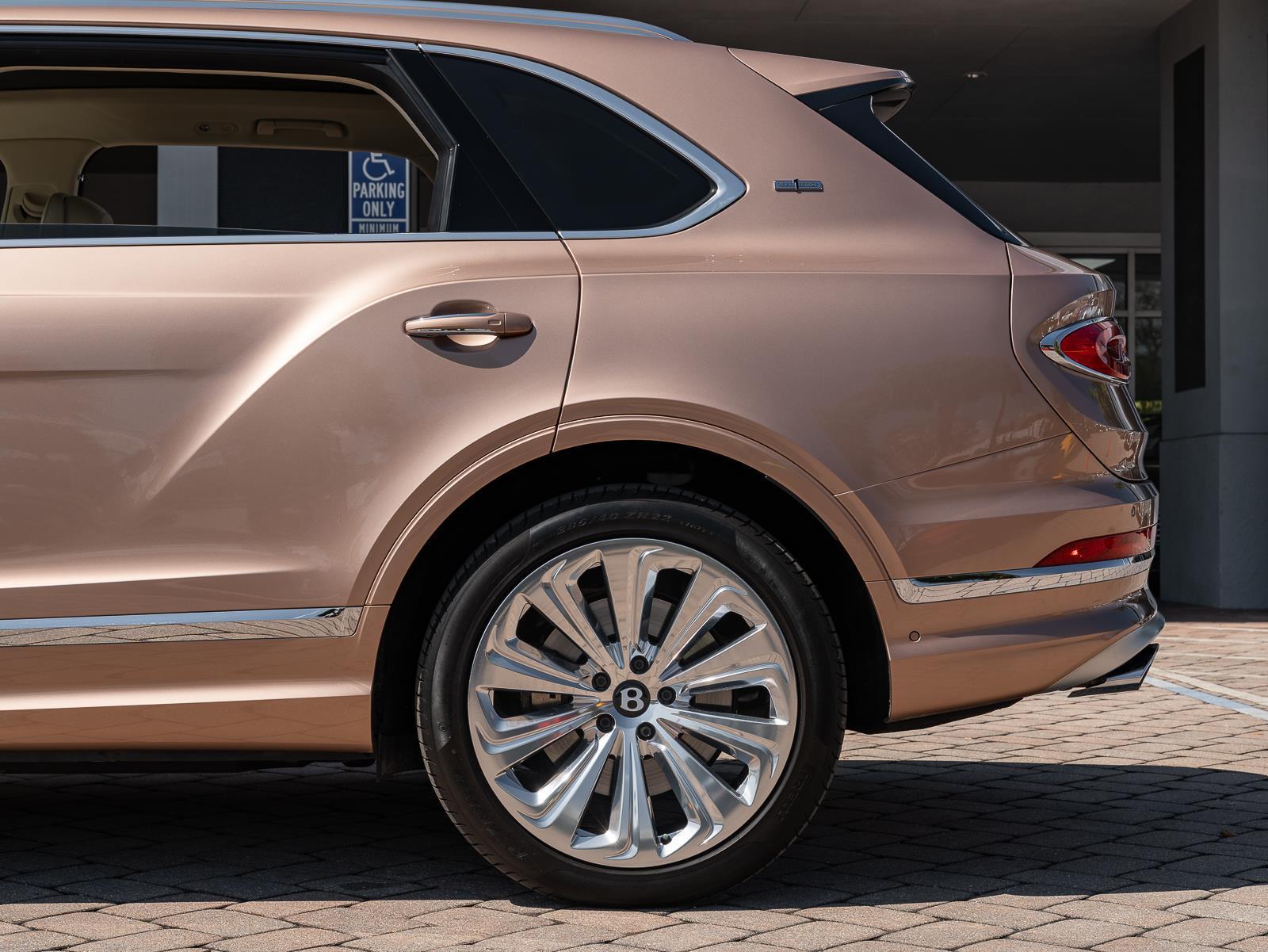 This 2023 Bentley Bentayga EWB Azure First Edition in Rose Gold Metallic over a Linen interior with only 9,447 miles blends ultra luxury rear cabin focus with genuine Bentley performance. Power comes from a 4.0 liter twin turbocharged V8 producing 542 horsepower and 568 lb ft of torque, paired to an 8 speed automatic transmission and permanent all wheel drive. Acceleration from 0 to 60 mph is rated at 4.5 seconds and top speed is in the 180 mph range, while curb weight for the extended wheelbase Bentayga sits near 5,542 lbs. Chassis and appointed features emphasize both ride quality and dynamic control for all occupants. The EWB uses adaptive air suspension with continuous damping control, Dynamic Ride active anti roll technology, rear wheel steering, and an electronically controlled limited slip differential to improve high speed stability and low speed maneuverability; Bentley calibrated the exhaust and cabin isolation to prioritize rear passenger serenity in the Azure specification. First Edition and Mulliner appointed details include unique directional 22 inch wheels, embroidered First Edition badging, extended rear legroom with executive seating options, premium Wilton wool and quilted leather trim, bespoke Mulliner veneers, rear center console options such as champagne chiller, and the latest Bentley infotainment with a rear seat entertainment package where specified.