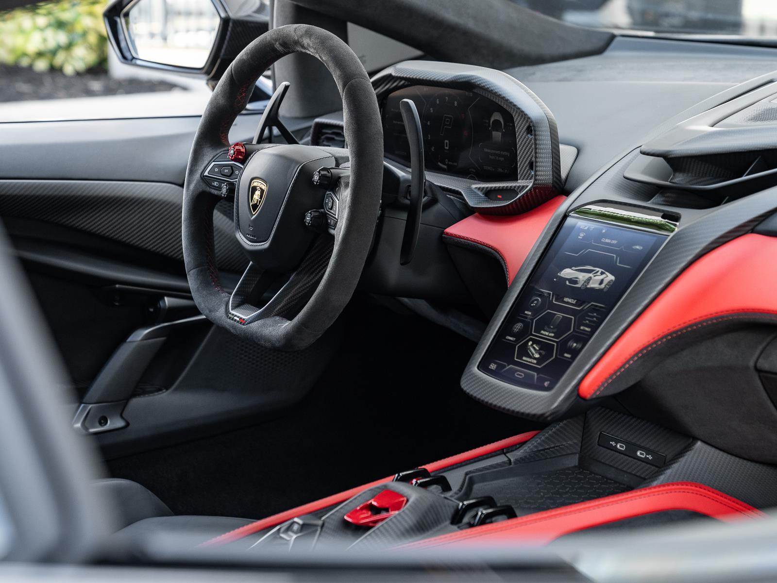 Options\n- Stitching Inverted\n- Carpets and mats bicolor\n- seat belt in rosso alala\n- Nero nemesis\n- Rosso CCB Brake calipers\n- Q citura on roof door panel contrast\n- Surround assistance pack\n- Rims Altanero Shiny black (21" front/ 22" back)\n- Aerodynamic door fin in carbon shiny\n- Parking pack\n- interior details carbon package\n- Steering wheel in full corsa Tex\n- Contrast color trim\n- Lower exterior carbon package shiny\n- Upper exterior carbon package shiny\n- Fully electric and heated seats\n- Floor mats with leather border\n- Livery with stripe in Rosso Mars / Rosso\n- Passenger Display\n- Bocca nera body color front bumper\n- Smartphone interface and connected\n- Rim bolts in titanium\n- Exhaust tailpipes in matt black\n- Embroidered Lamborghini Logo on High assistant\n\n\n