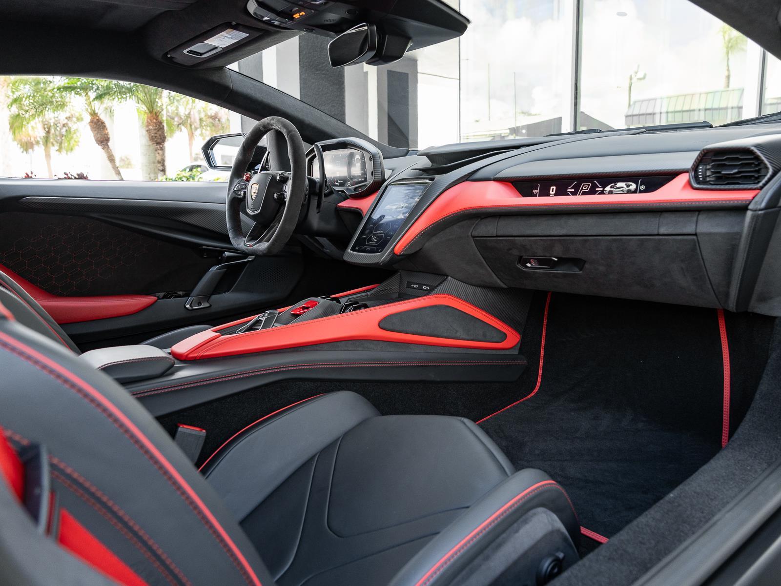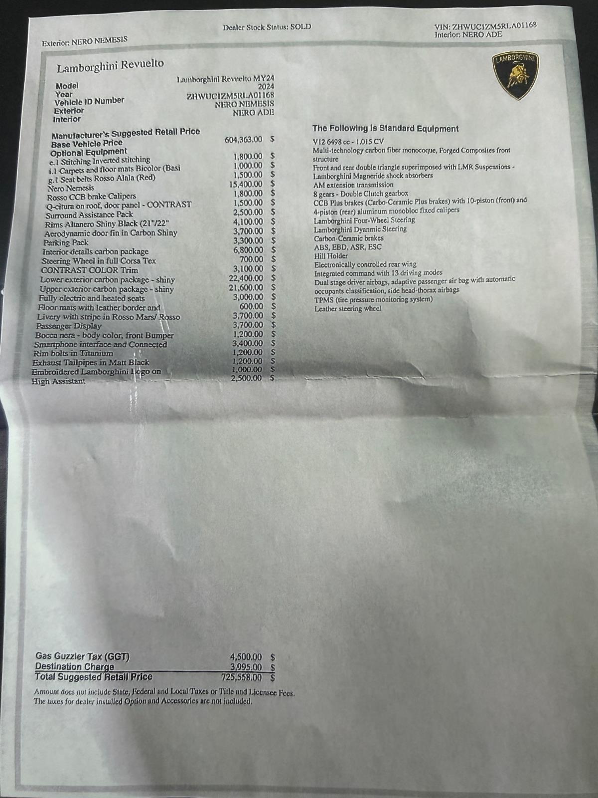 This 2024 Lamborghini Revuelto finished in commanding Black over Black is a no compromise statement of modern Lamborghini power. The stealth exterior sharpens every angular surface, active aero element, and dramatic intake, giving the Revuelto a technical, almost weaponized presence. Dihedral doors rise to reveal a cockpit wrapped in black leather and Alcantara, accented by carbon fiber and a fully digital interface built around the driver. With just 982 miles, this example remains exceptionally fresh and tightly kept. Beneath the sculpted rear deck sits a naturally aspirated 6.5 liter V12 paired with three electric motors, producing a combined 1,001 horsepower, managed through an 8 speed dual clutch transmission and advanced all wheel drive system.\n\nAcceleration is violent and immediate. The Revuelto launches from 0 to 60 mph in 2.5 seconds and reaches a top speed exceeding 217 mph, delivering instant electric torque backed by the raw scream of a high revving V12. With a curb weight of 3,906 pounds, a carbon fiber monofuselage chassis, torque vectoring system, and active aerodynamics provide extraordinary grip and stability under extreme load. Massive carbon ceramic brakes deliver relentless stopping power to match its acceleration. The 2024 Revuelto stands at the peak of Lamborghini engineering, blending hybrid innovation with pure V12 emotion in a machine built to dominate both road and track.\n\n