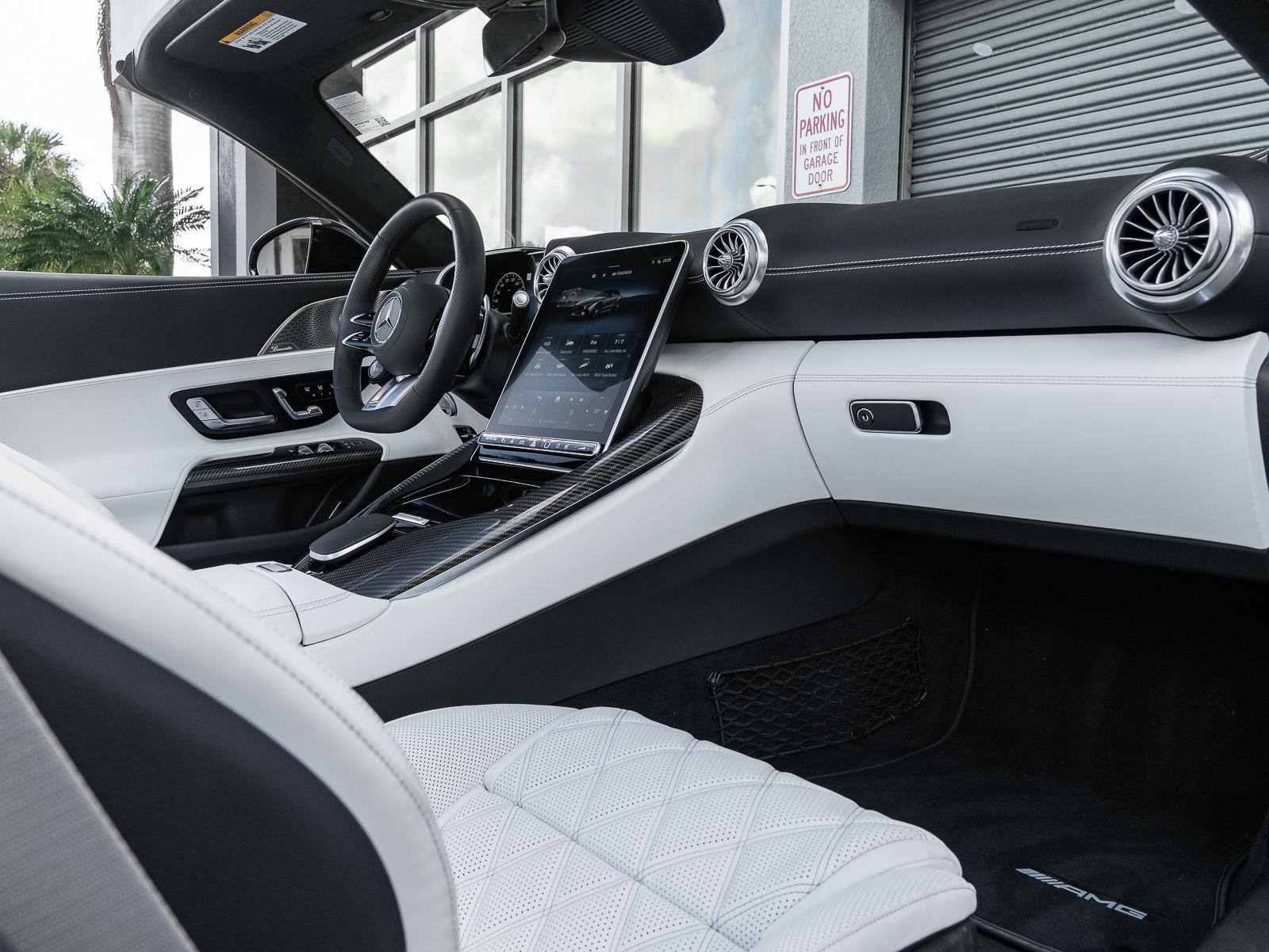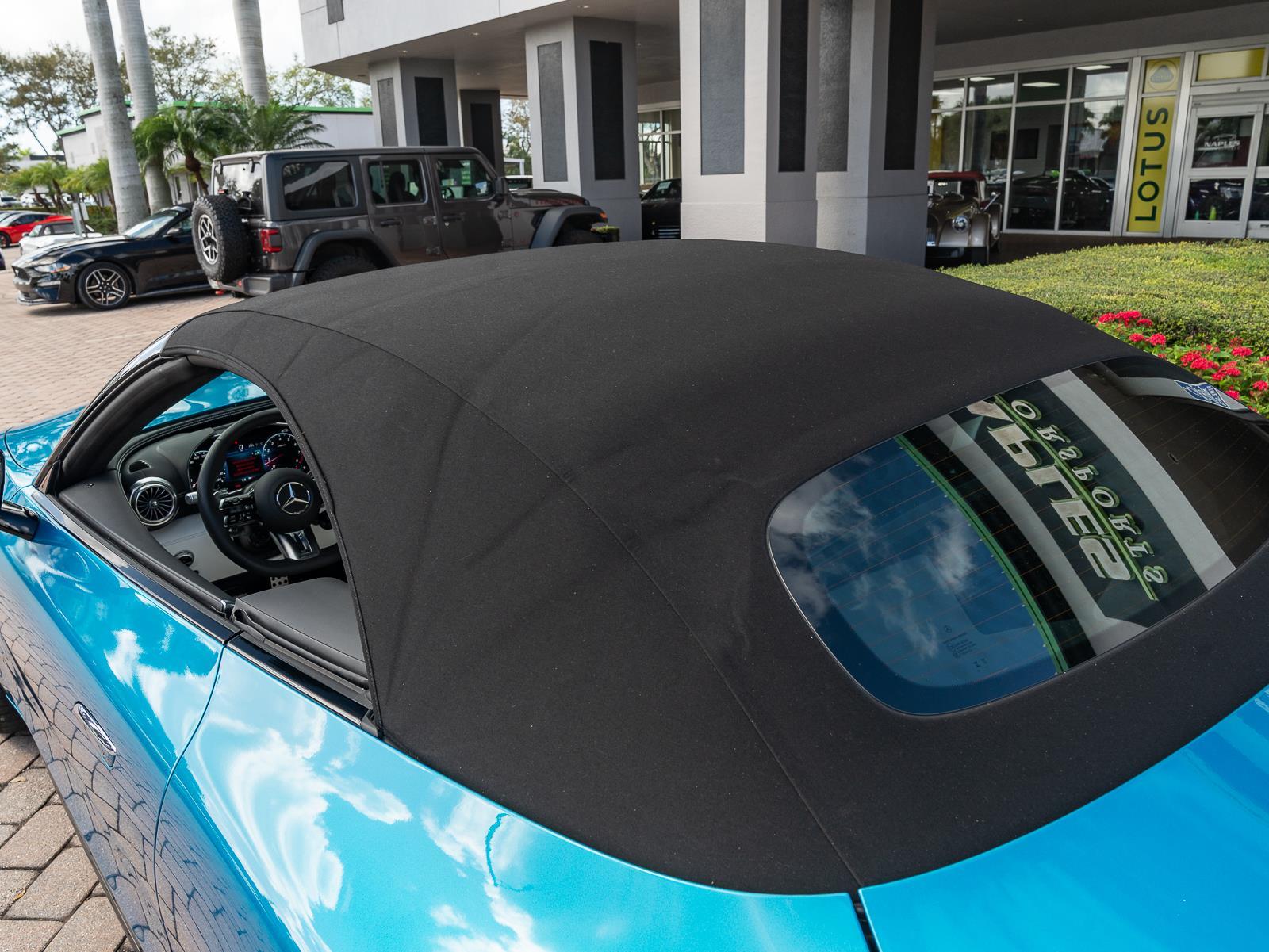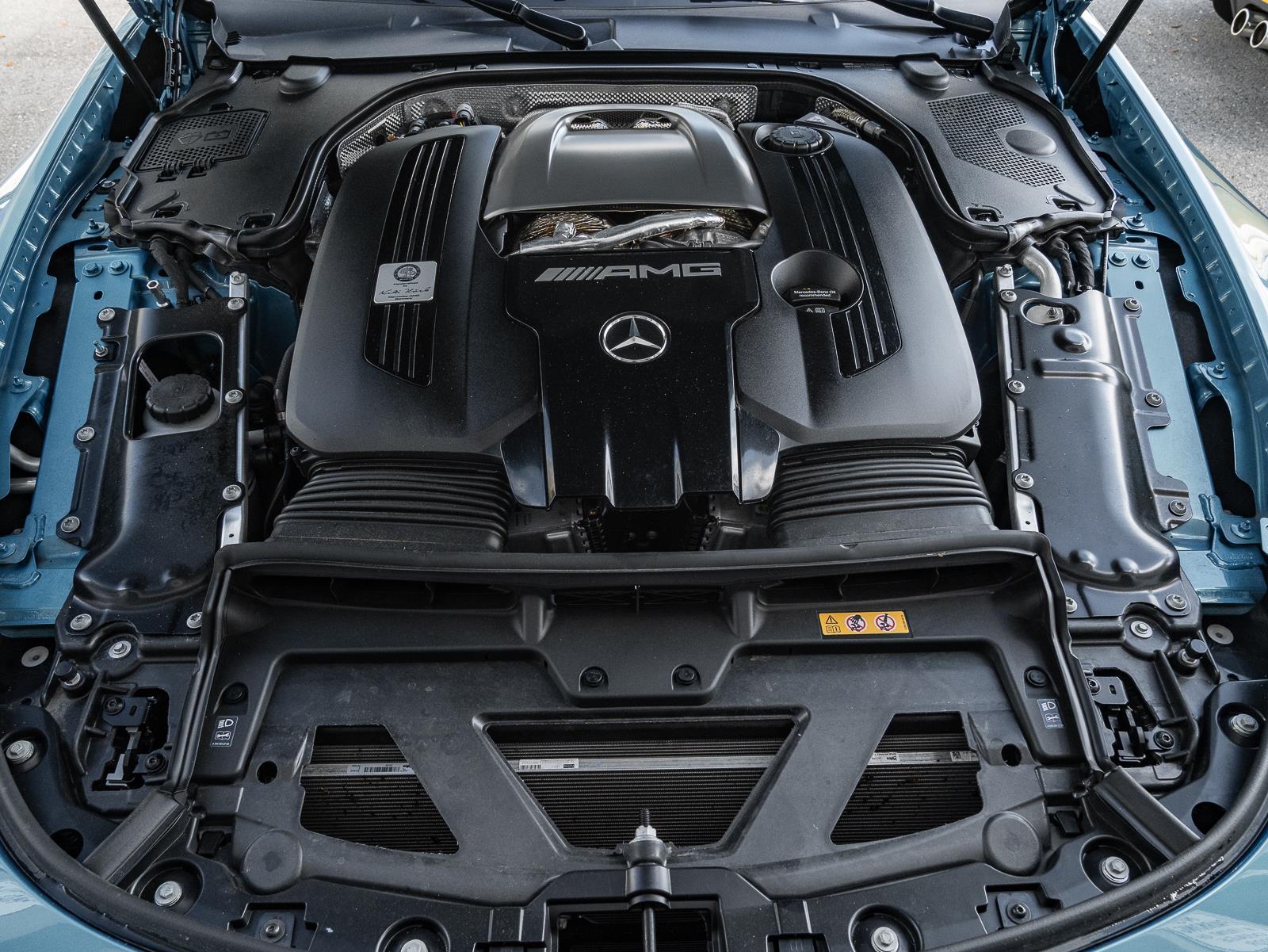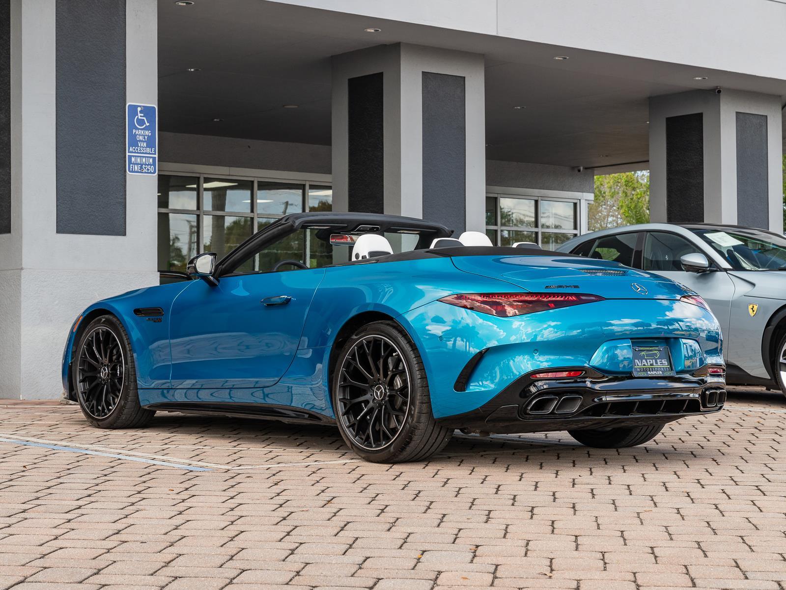 This 2024 Mercedes-Benz AMG SL 63 Convertible finished in striking Hyper Blue Metallic over a Crystal White leather interior with only 2,407 miles represents the modern rebirth of the legendary SL roadster, blending handcrafted AMG performance with advanced luxury and cutting edge chassis technology. Power comes from a handcrafted AMG 4.0 liter twin turbocharged V8 producing 577 horsepower and 590 lb ft of torque, paired to an AMG SPEEDSHIFT MCT 9 speed automatic transmission that sends power to all four wheels through the AMG Performance 4MATIC+ all wheel drive system. This configuration delivers explosive performance, accelerating from 0 to 60 mph in about 3.5 seconds and reaching a top speed of 196 mph. The aluminum intensive chassis and rigid roadster architecture maintain a curb weight around 4,321 lbs, allowing the SL 63 to combine grand touring comfort with genuine supercar level acceleration. \n\nThe chassis engineering is equally advanced, featuring AMG Active Ride Control suspension with active hydraulic roll stabilization that minimizes body roll while maintaining ride comfort during everyday driving. Rear axle steering improves low speed maneuverability and high speed stability, while massive AMG high performance brakes and staggered performance wheels provide exceptional stopping power and grip. The convertible design incorporates a lightweight fabric soft top that can open or close in roughly 15 seconds at speeds up to about 37 mph, preserving the car's sleek silhouette and structural rigidity. Inside, the cabin reflects modern Mercedes luxury with a large portrait oriented central touchscreen, a fully digital driver display, premium Crystal White Nappa leather upholstery, heated and ventilated AMG performance seats, Burmester premium audio, and extensive driver configurable AMG Dynamic Select drive modes. In this vivid Hyper Blue Metallic specification with extremely low mileage, the SL 63 AMG delivers a compelling combination of open air grand touring, cutting edge technology, and the unmistakable character of AMG's handcrafted twin turbo V8.\n\n\n