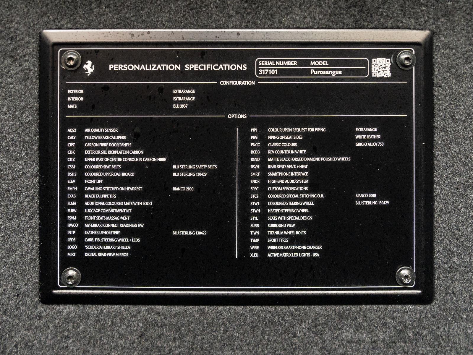 \n\nOptions\n\n-AIR QUALITY SENSOR\n-YELLOW BRAKE CALLIPERS\n-CARBON FIBRE DOOR PANELS\n-EXTERIOR SILL KICKPLATE IN CARBON\n-UPPER PART OF CENTRE CONSOLE IN CARBON FIBRE\n-COLOURED SEAT BELTS\n-BLU STERLING SAFETY BELTS\n-COLOURED UPPER DASHBOARD BLU STERLING\n-FRONT LIFT\n-CAVALLINO STITCHED ON HEADREST BIANCO 2000\n-BLACK TAILPIPE TIPS\n-ADDITIONAL COLOURED MATS WITH LOGO\n-LUGGAGE COMPARTMENT KIT\n-FRONT SEATS MASSAG-VENT\n-MYFERRARI CONNECT READINESS HW\n-LEATHER UPHOLSTERY BLU STERLING\n-CARB. FIB. STEERING WHEEL + LEDS\n-SCUDERIA FERRARI' SHIELDS\n-DIGITAL REAR-VIEW MIRROR\n-COLOUR UPON REQUEST FOR PIPING\n-PIPING ON SEAT SIDES\n-CLASSIC COLOURS\n-REV COUNTER IN WHITE\n-MATTE BLACK FORGED DIAMOND POLISHED WHEELS\n-REAR SEATS VENT. + HEAT\n-SMARTPHONE INTERFACE\n-HIGH-END AUDIO SYSTEM\n-CUSTOM SPECIFICATIONS\n-COLOURED SPECIAL STITCHING O.R.\n-COLOURED STEERING WHEEL\n-HEATED STEERING WHEEL\n-SEATS WITH SPECIAL DESIGN\n-SURROUND VIEW\n-TITANIUM WHEEL BOLTS\n-SPORT TYRES\n-WIRELESS SMARTPHONE CHARGER\n-ACTIVE MATRIX LED LIGHTS - USA\n\n\n\n\n