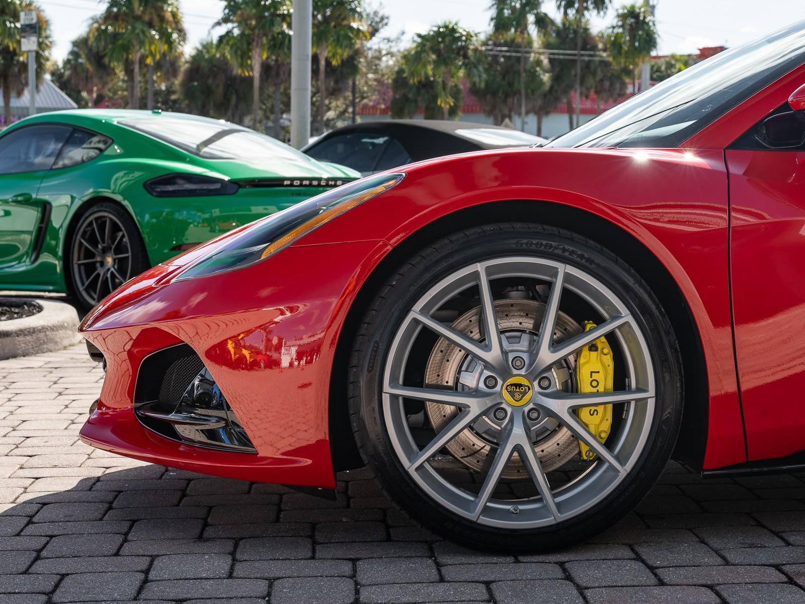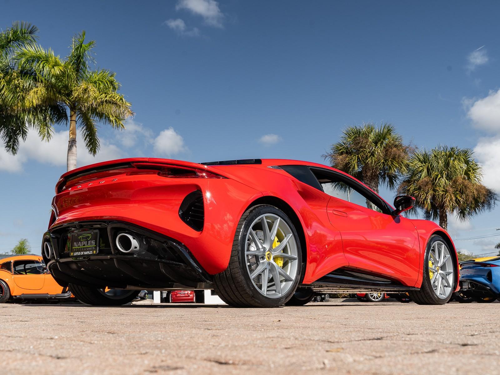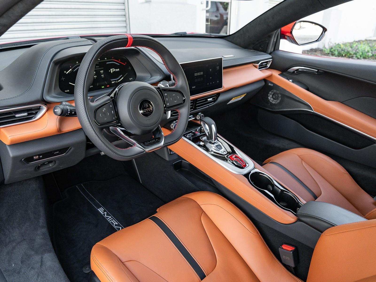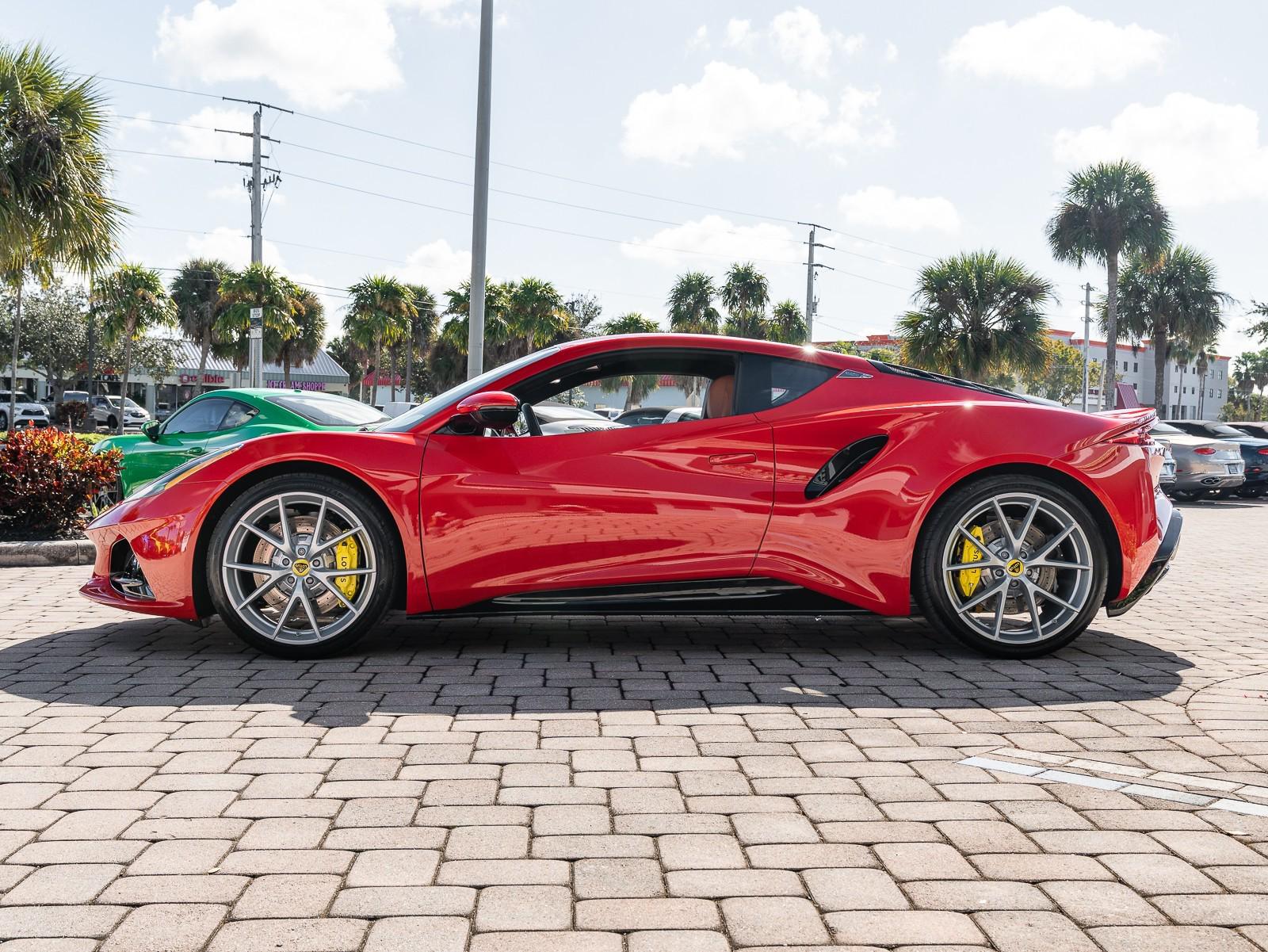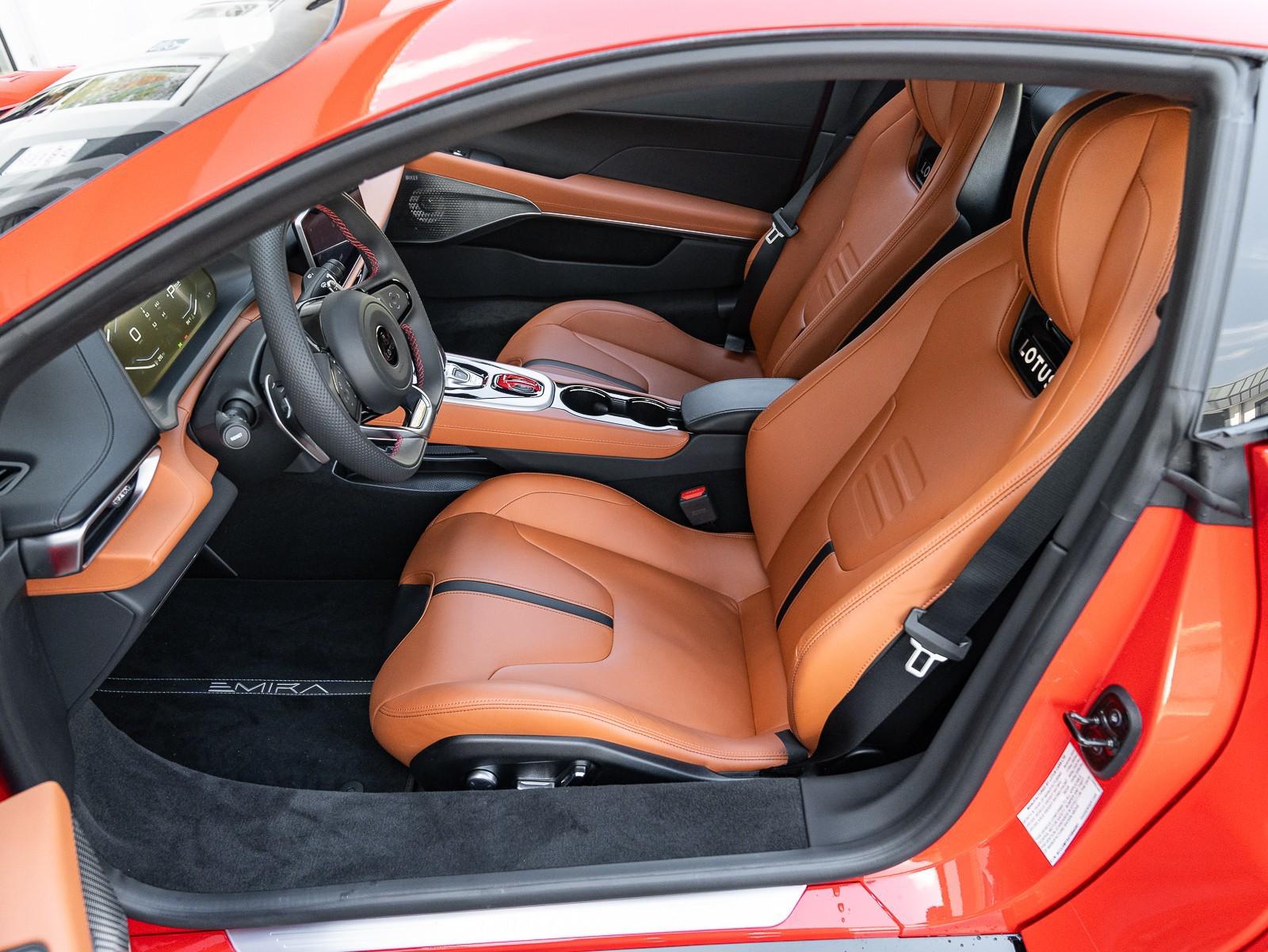 This 2026 Lotus Emira Turbo SE is the high-performance evolution of Lotuss final internal combustion sports car, featuring a mid mounted 2.0 liter turbocharged inline four engine sourced from Mercedes AMG that produces an impressive 400 hp and 354 lb-ft of torque . Power is delivered exclusively through a lightning-fast 8-speed dual-clutch automatic transmission (DCT) which has been recalibrated for the 2026 model year to provide even sharper shiftspropelling the roughly 3,230 lb coupe from 0 to 60 mph in approximately 4 seconds toward a top speed of 180 mph . Dressed in striking Vivid Red over a sophisticated Tan leather interior , this Special Edition (SE) version comes standard with the Lotus Drivers Pack , which includes a softer touring suspension and cross-drilled two-piece brake discs, effectively bridging the gap between a daily-drivable grand tourer and a track-focused weapon. Notable 2026 refinements include a revised cooling system for sustained hard driving and updated aerodynamics that maintain the Emira's mini-supercar aesthetic while ensuring high-speed stability. Options: - Vivid Red - Touring Suspension - Lower black Pack - Yellow Brake Calipers - 20 V Spoke Ultra Lightweight Gloss Silver Wheels - Tan Leather Interior - Black Leather Steering Wheel with Red TDC and Stitching - Alcantara Headliner - Yellow and Black Nose Badge and Center Caps - KEF Premium Audio System - Goodyear Eagle F1 Supersport - Sport Pedals